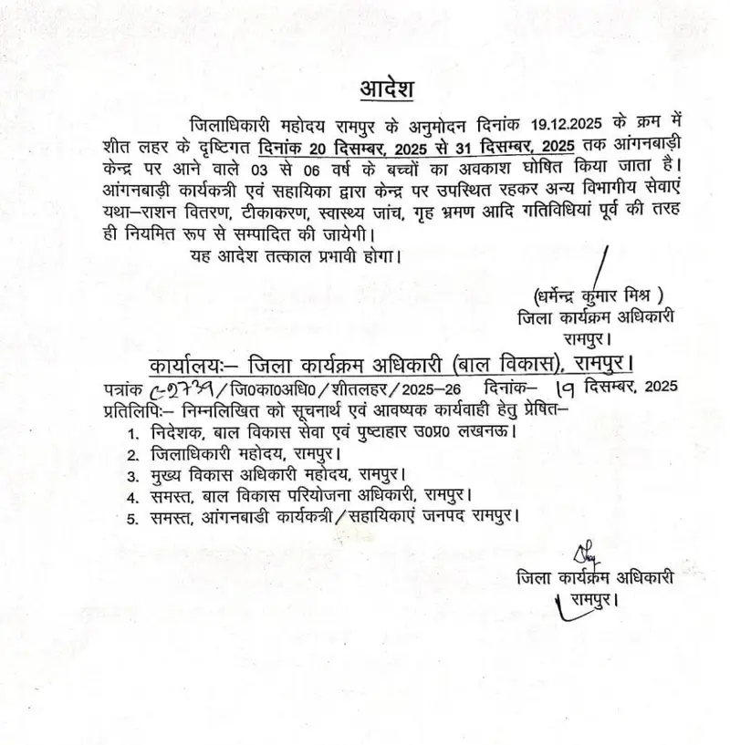 रामपुर जिले में अत्यधिक ठंड को देखते हुए जिला प्रशासन ने बड़ा फैसला लिया है। जारी आदेश के अनुसार आंगनबाड़ी केंद्रों में आने वाले 3 से 6 वर्ष तक के सभी बच्चों के लिए 31 दिसंबर 2025 तक अवकाश घोषित कर दिया गया है। यह आदेश जिला अधिकारी द्वारा जिला कार्यक्रम अधिकारी के माध्यम से जारी किया गया है। प्रशासन ने स्पष्ट किया है कि यह निर्णय बच्चों के स्वास्थ्य और सुरक्षा को ध्यान में रखते हुए लिया गया है, ताकि उन्हें ठंड में घर से बाहर न निकलना पड़े। हालांकि इस अवधि में आंगनबाड़ी केंद्र खुले रहेंगे और कार्यकर्ता केंद्र पर उपस्थित रहकर विभागीय कार्य नियमित रूप से करती रहेंगी।